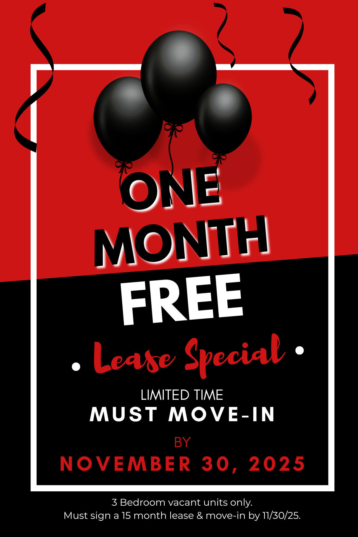 Vacant 3 Bedroom units only. Must sign a 15 month lease and move-in by 11/30/25. One-Time One Month Rent Free will be applied as a rent credit on the 2nd month rent statement. Limited availability, offer subject to change without notice.